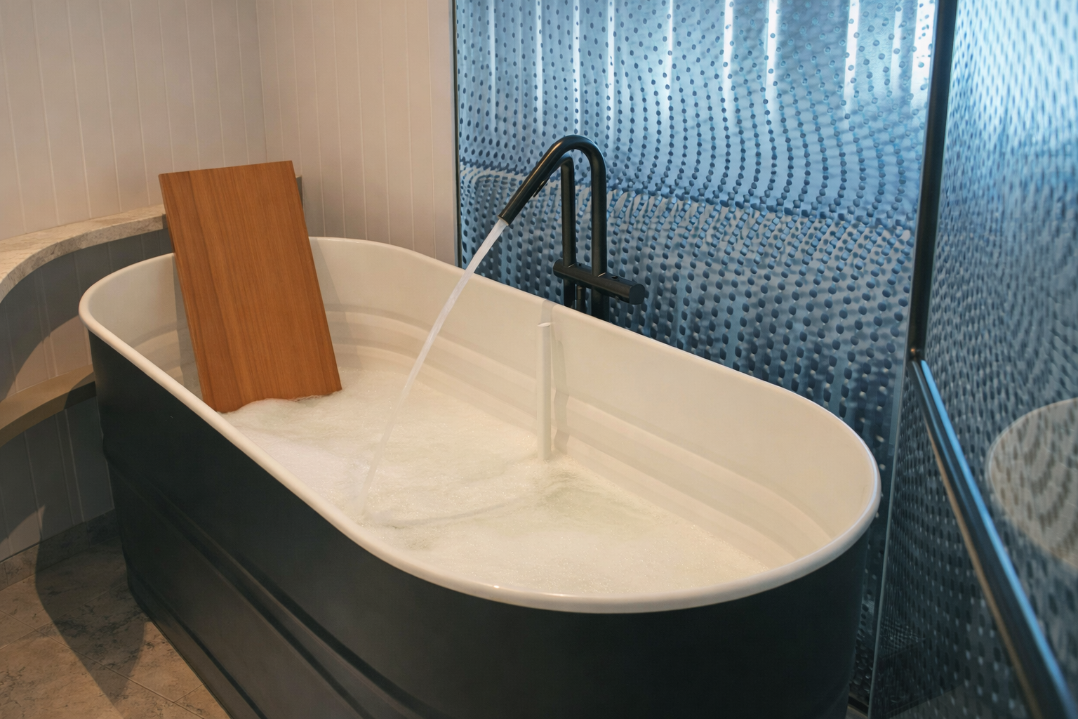 Een slanke vrijstaande badkraan . Perfect voor strakke, moderne badkamers.